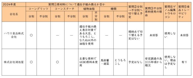 質問内容は①原材料のコーングリッツ、コーンスターチ、植物油脂、糖類の遺伝子組み換えか否か、②遺伝子組み換え分別生産流通管理済み(非遺伝子組み換え)の原料を使用している製品に関して、今後、不分別のものに切り替える予定があるか、③不分別の原料を使用している理由と不分別に切り替えた時期について、④ゲノム編集トウモロコシの利用の予定について、⑤原材料及び製品に関するトレーサビリティ(入出荷記録の保存、製造ロットと入出荷ロットの対応付け記録)の有無について。
