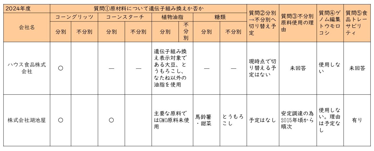 2024年6月7日付でコーンスナック菓子メーカー4社(ハウス食品株式会社、ヤマザキビスケット株式会社、株式会社やおきん、株式会社湖池屋)に、非遺伝子組み換え及びゲノム編集原材料の使用に関する公開質問状を送り、2社から回答がありました。