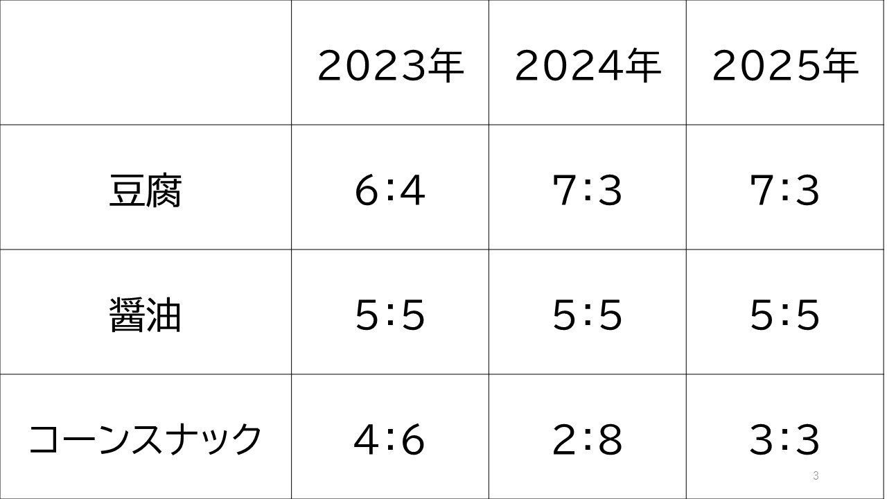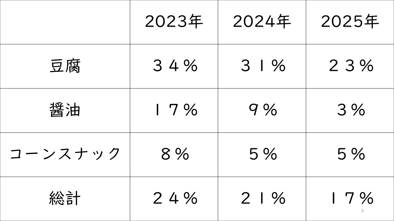 ・ 豆腐・醤油の割合はほぼ同じような傾向(23年/24年/25年の有・無)だが、コーンスナックは表示なしが増加傾向にある。